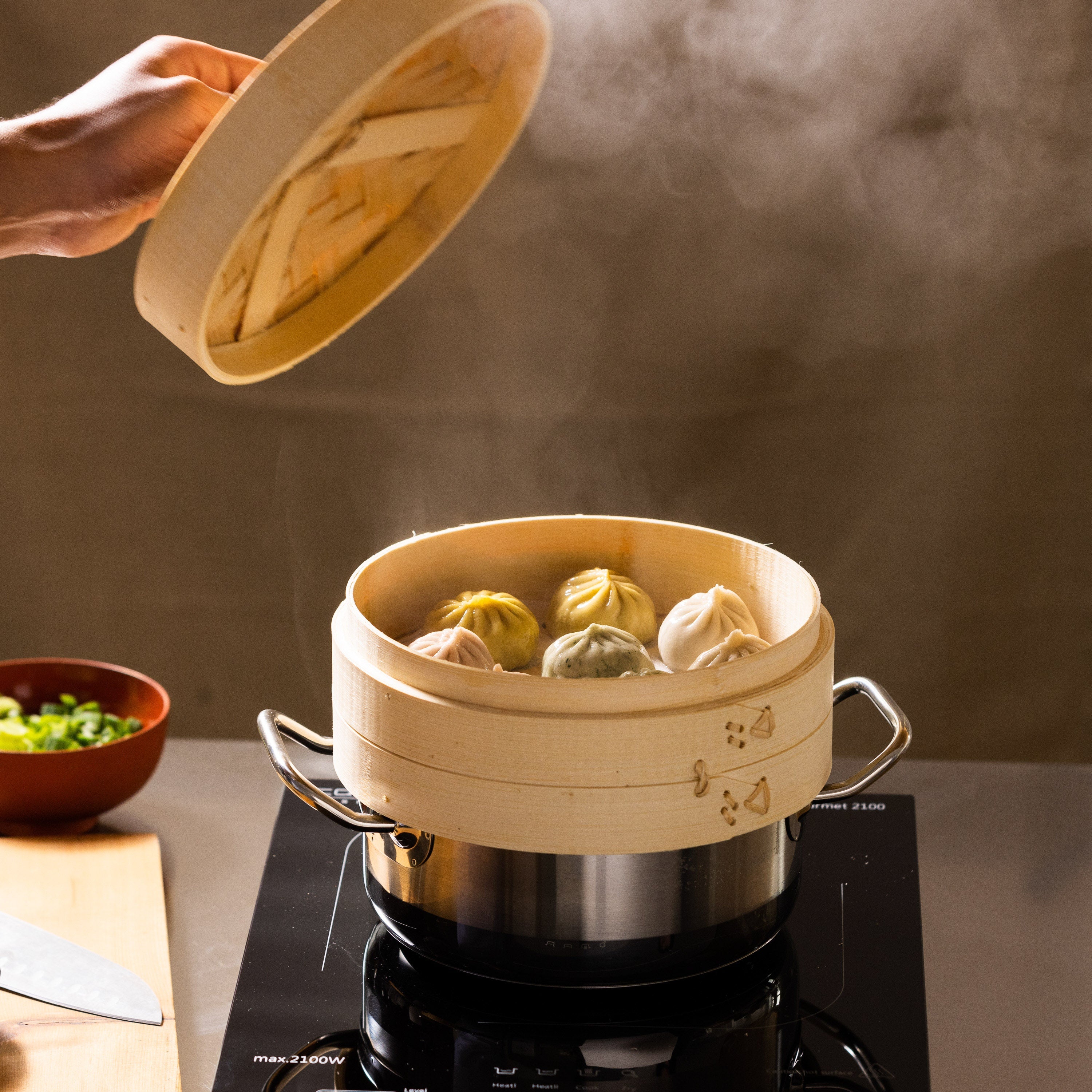 Bambus Steamer mit gelochtem Dampfpapier (gratis dabei) auslegen.
